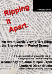 This workshop demonstrated the work in progress under taken by Category Three in order to produce a new theory on theatre, which aims to renegotiate the relationship between audiences and performers as well as the wider context of the world surrounding us all.